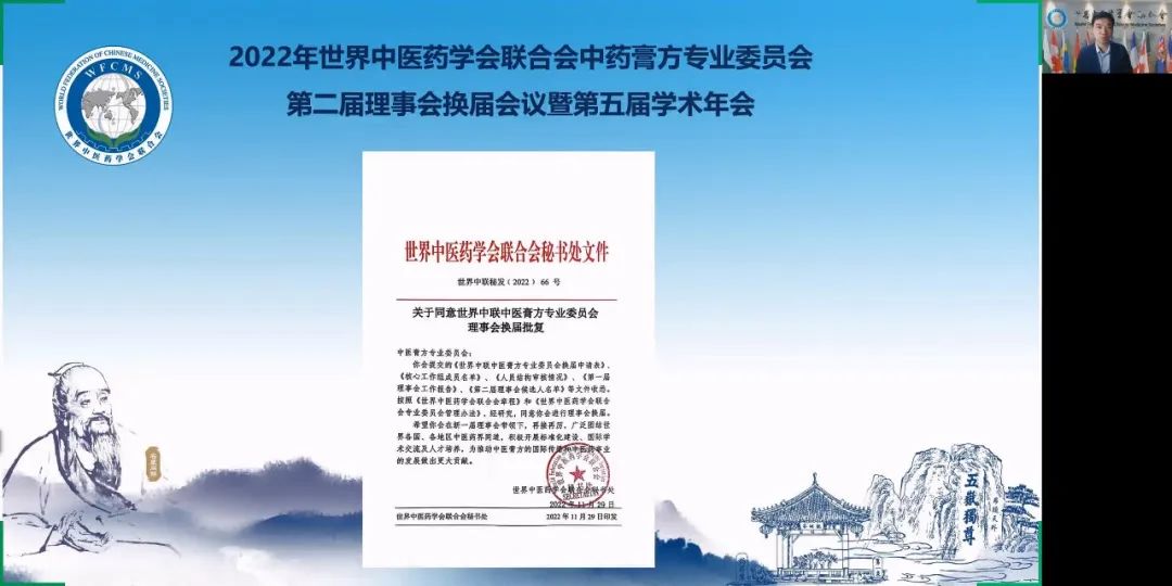 世界中聯(lián)主席馬建中通過(guò)視頻方式致辭,向參加中醫(yī)膏方專業(yè)委員會(huì)第二屆理事會(huì)換屆會(huì)議的線上嘉賓表示歡迎。他講到,近年來(lái),黨和國(guó)家高度重視中醫(yī)藥的發(fā)展,出臺(tái)了一系列支持政策,黨的二十大報(bào)告再次強(qiáng)調(diào)“促進(jìn)中醫(yī)藥創(chuàng)新傳承發(fā)展”,這些都為中醫(yī)藥事業(yè)發(fā)展提供了堅(jiān)強(qiáng)保障。世界中聯(lián)是全球最大的中醫(yī)藥國(guó)際學(xué)術(shù)組織,在中醫(yī)藥深入?yún)⑴c全球治理中持續(xù)發(fā)揮著重要作用。在中醫(yī)藥深入?yún)⑴c全球治理中持續(xù)發(fā)揮著重要作用。膏方是中醫(yī)養(yǎng)生文化的精髓,在進(jìn)補(bǔ)方面有深厚的臨床經(jīng)驗(yàn),膏方即可治療慢性疾病又可滋補(bǔ)大病過(guò)后的虛弱病體,是兼顧治療和補(bǔ)虛雙重作用的良劑。中醫(yī)膏方專業(yè)委員會(huì)在董瑞會(huì)長(zhǎng)帶領(lǐng)下,在組織學(xué)術(shù)會(huì)議和開展國(guó)際交流、抗擊疫情、科研創(chuàng)新、醫(yī)療幫扶等方面做了大量工作,促進(jìn)了中醫(yī)膏方走向世界,關(guān)注民間中醫(yī)藥瑰寶的挖掘整理,通過(guò)政協(xié)提案促進(jìn)民間膏方傳承及其制作工藝的搶救,為保護(hù)民間膏方獻(xiàn)技出力,開展科研課題與臨床實(shí)踐提高藥方、膏方的臨床療效,踐行“療效是中醫(yī)藥生命線”的真理,發(fā)出倡議鼓勵(lì)理事們積極投入抗疫,第一屆理事會(huì)工作取得了突出成績(jī),榮獲了世界中聯(lián)頒發(fā)的“抗擊疫情榮譽(yù)集體”稱號(hào)和2020-2021年度先進(jìn)分支機(jī)構(gòu)三等獎(jiǎng)。希望新一屆理事會(huì)在董瑞會(huì)長(zhǎng)領(lǐng)導(dǎo)下,能夠充分發(fā)揮世界中聯(lián)平臺(tái)優(yōu)勢(shì),繼續(xù)辦好“一帶一路”雁棲湖中醫(yī)膏方國(guó)際高峰論壇,加快膏方相關(guān)標(biāo)準(zhǔn)起草,促進(jìn)膏方產(chǎn)品和市場(chǎng)開發(fā),加強(qiáng)國(guó)際交流交往,助力中醫(yī)藥走向世界。