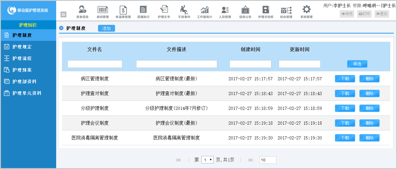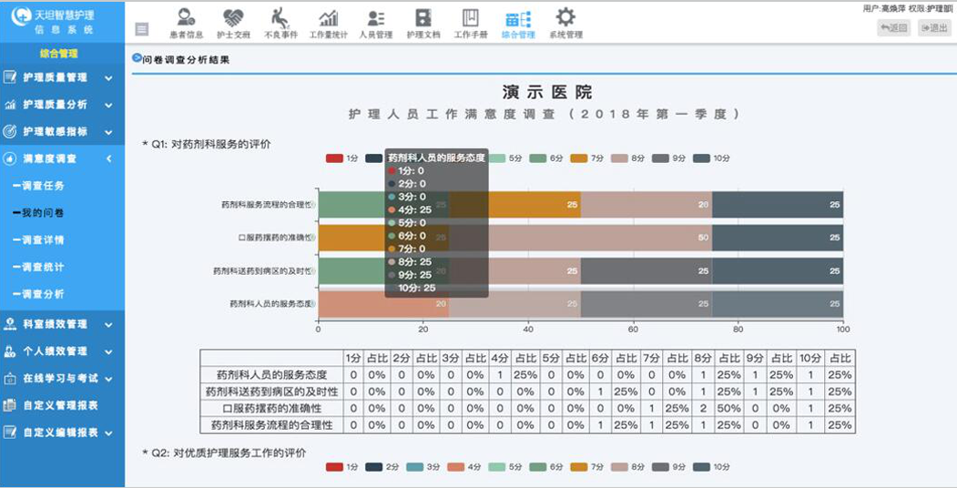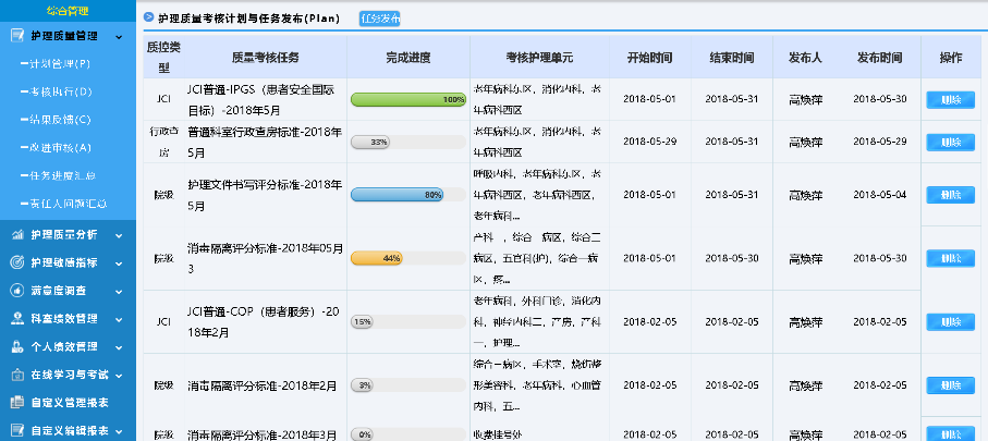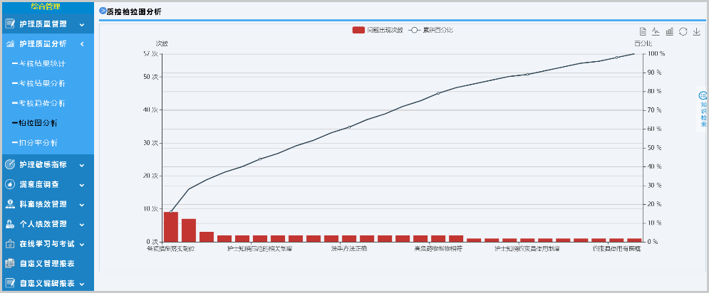 針對護理質量管理重點,支持自定義質控表單,使用評分、扣分等多種考核方式,電子化護理質量考核、持續(xù)跟蹤記錄,并可以用于統計分析。