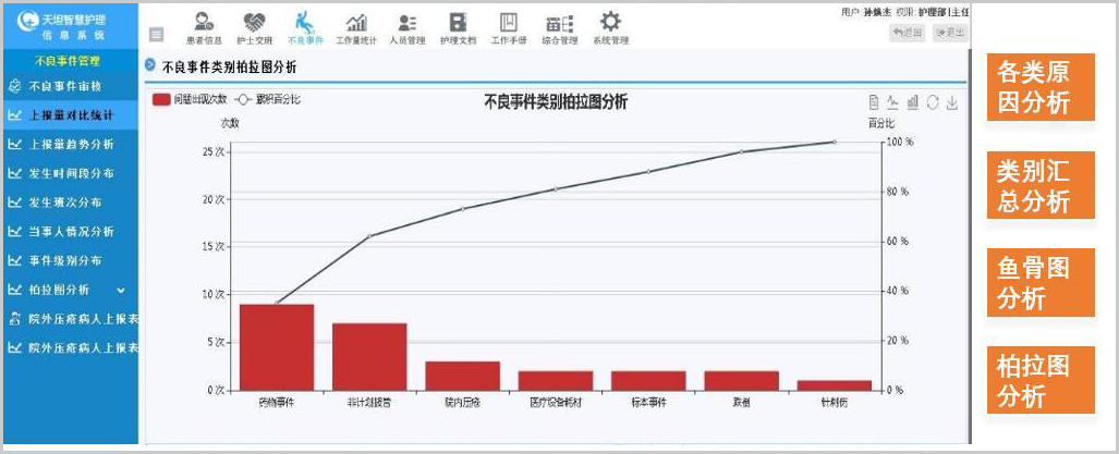 支持14項目+時間+科室+個人+患者 超精細化統計分析,自動抽取 跌倒評估、墜床評估等護理文書數據,進行二次機構化統計分析,極大降低工作量。