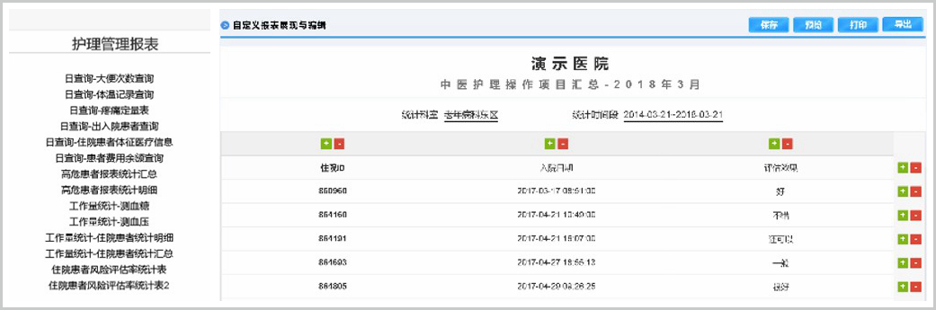 系統內置具有高度可配置性的自定義報表功能,不僅支持查詢分析類報表更加可以實現基于報表的二次錄入和實時編輯,充分滿足護理統計預分析的個性化需求