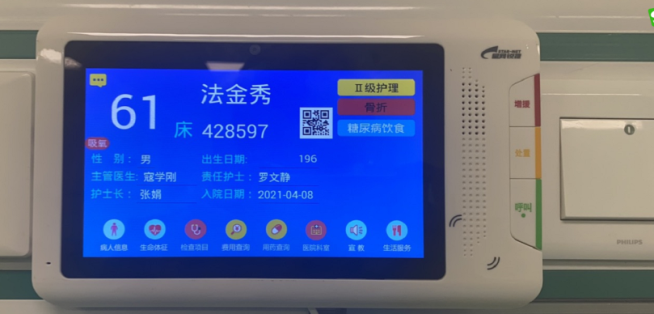入住科室的第一天,護士會對患者進行“入院宣教”,除了正常的住院注意事項外,還專門指導(dǎo)患者學(xué)會了病床上方患者端的“ 智能電子床頭屏”,它是患者住院期間的信息小助手,通過它不僅可以查詢患者的體征數(shù)據(jù)、護理事項、住院費用、檢查項目預(yù)約情況、住院及治療須知等豐富信息,還可以提供點餐、醫(yī)療服務(wù)評價等服務(wù)。